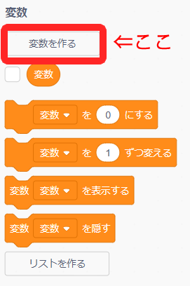 まず、「変数」の一番上のところにある、「変数を作る」をクリックして、