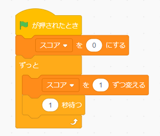 スコアが、1秒ずつ増えていきます。これでスコアは、完成です。