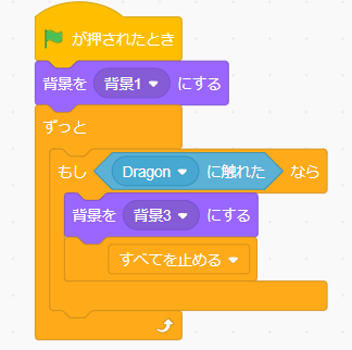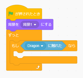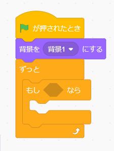 次に、「見た目」のところにある、「背景を背景1▾にする」のブロックをつなげて、