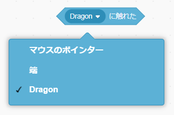その中に、「調べる」のところにある、「マウスのポインター▾に触れた」のブロックを出して、
