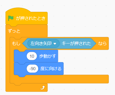 「動き」のところにある、「10歩動かす」と、「90度に向ける」を出して、