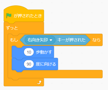 「動き」のところにある、「10歩動かす」と、「90度に向ける」を出したら、