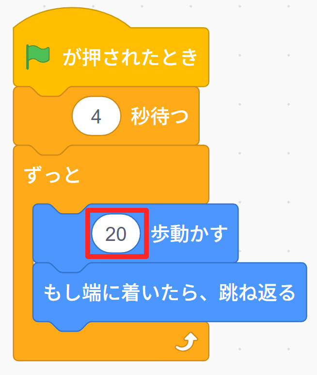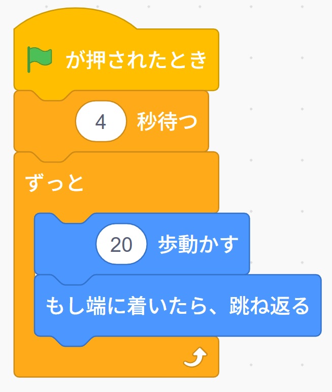 「4秒待つ」は、最初の、「3,2,1、スタート!」を待つためにいれています!