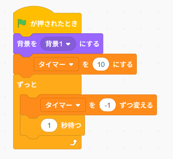 「my variable▾を1ずつ変える」の、「1」のところを、「-1」にします、これで時間を減らすようにします!